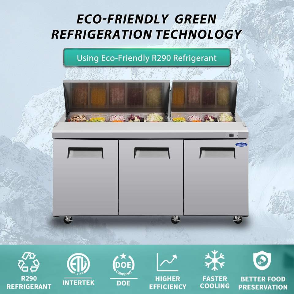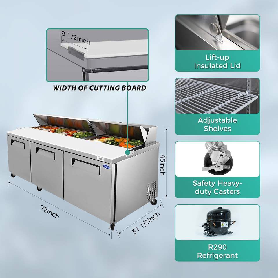 อุปกรณ์ทำความเย็นสำหรับครัวเชิงพาณิชย์ Orikool 72 โต๊ะเตรียมอาหารแซนด์วิชและสลัด พร้อมที่ตัดเนื้อแบบบล็อก ฝาปิดป้องกันความเย็น