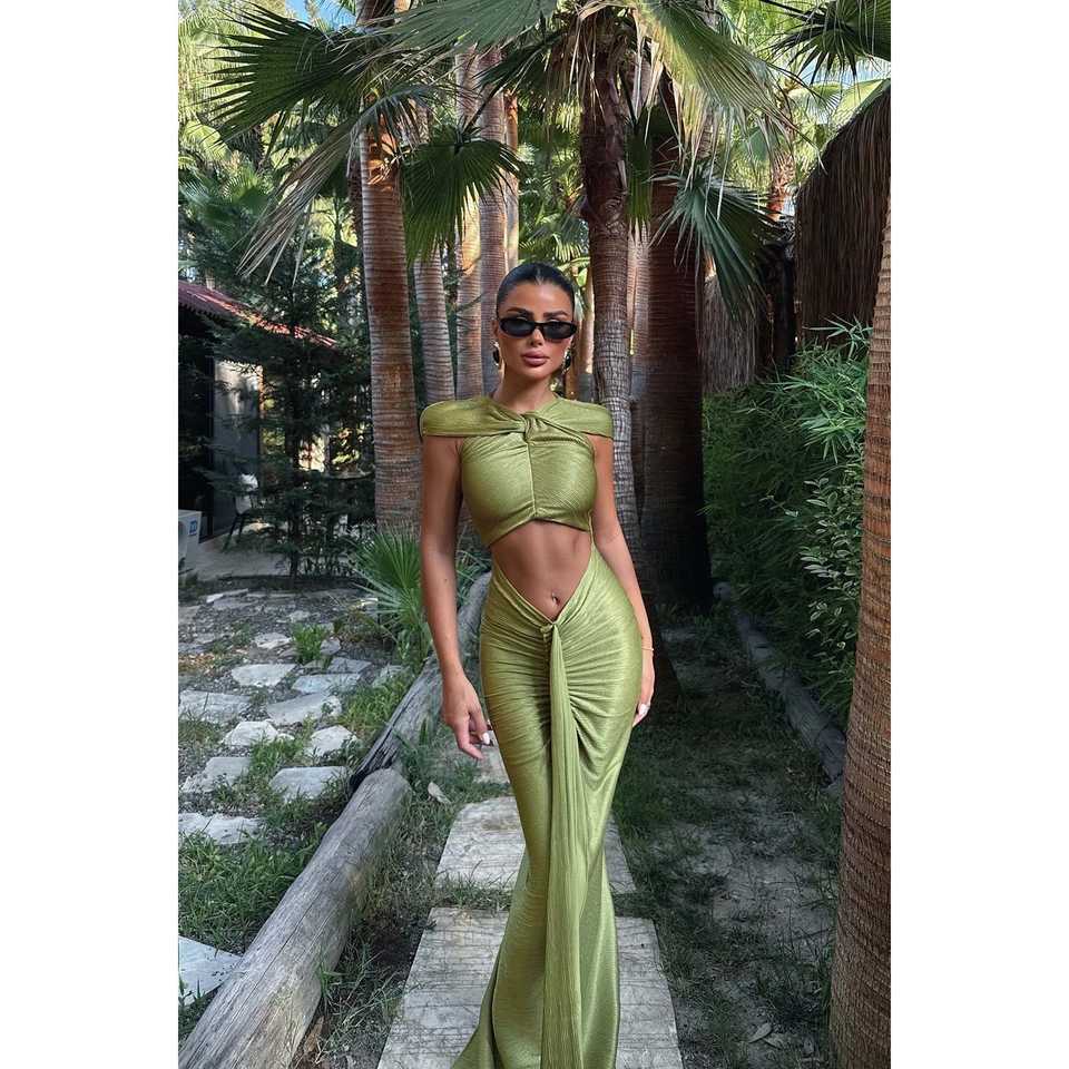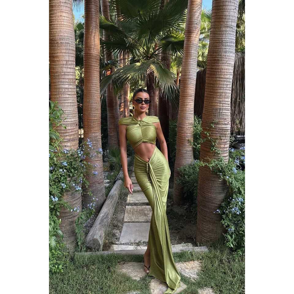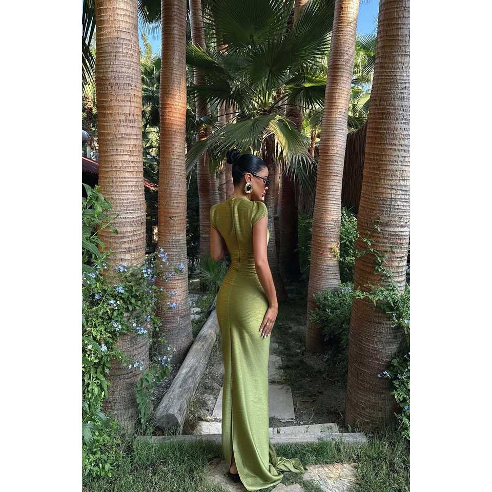 ชุดเดรสทรงเอไลน์สีเขียวมะกอกยาวแบบออร์ลีนส์ คอวี ทรงเอ็มไพร์ แต่งโครเชต์ ระบายเป็นชั้นๆ ประดับด้วยคริสตัลและเลื่อม เหมาะสำหรับงานแต่งงานและงานปาร์ตี้