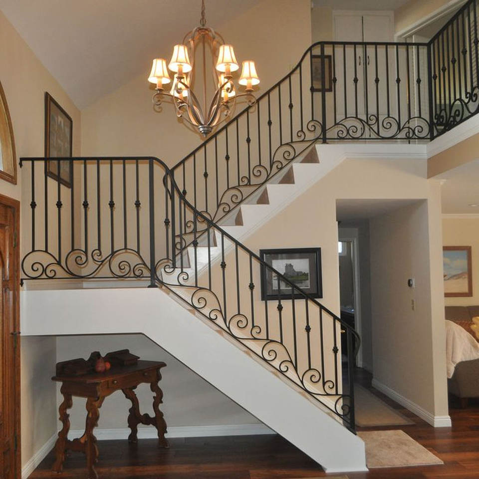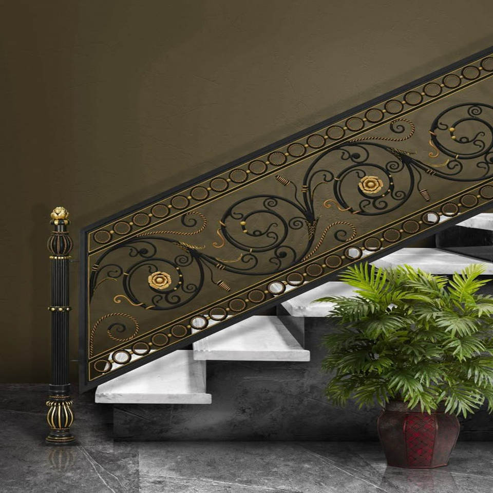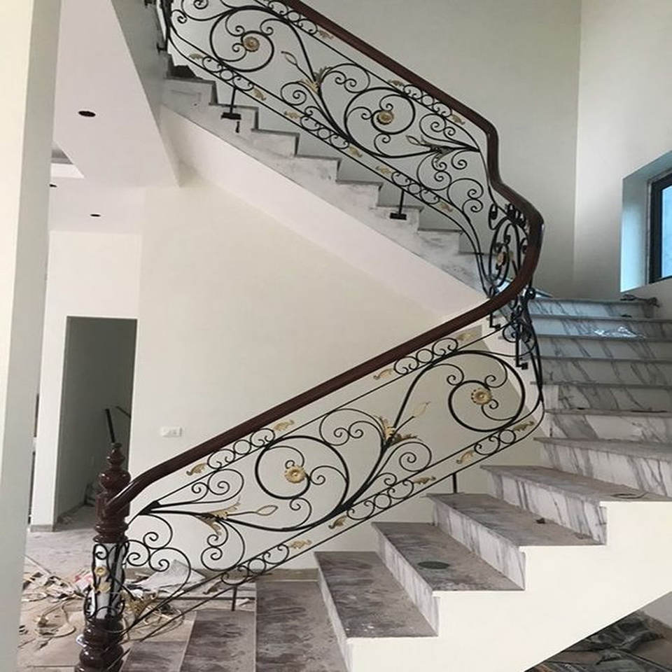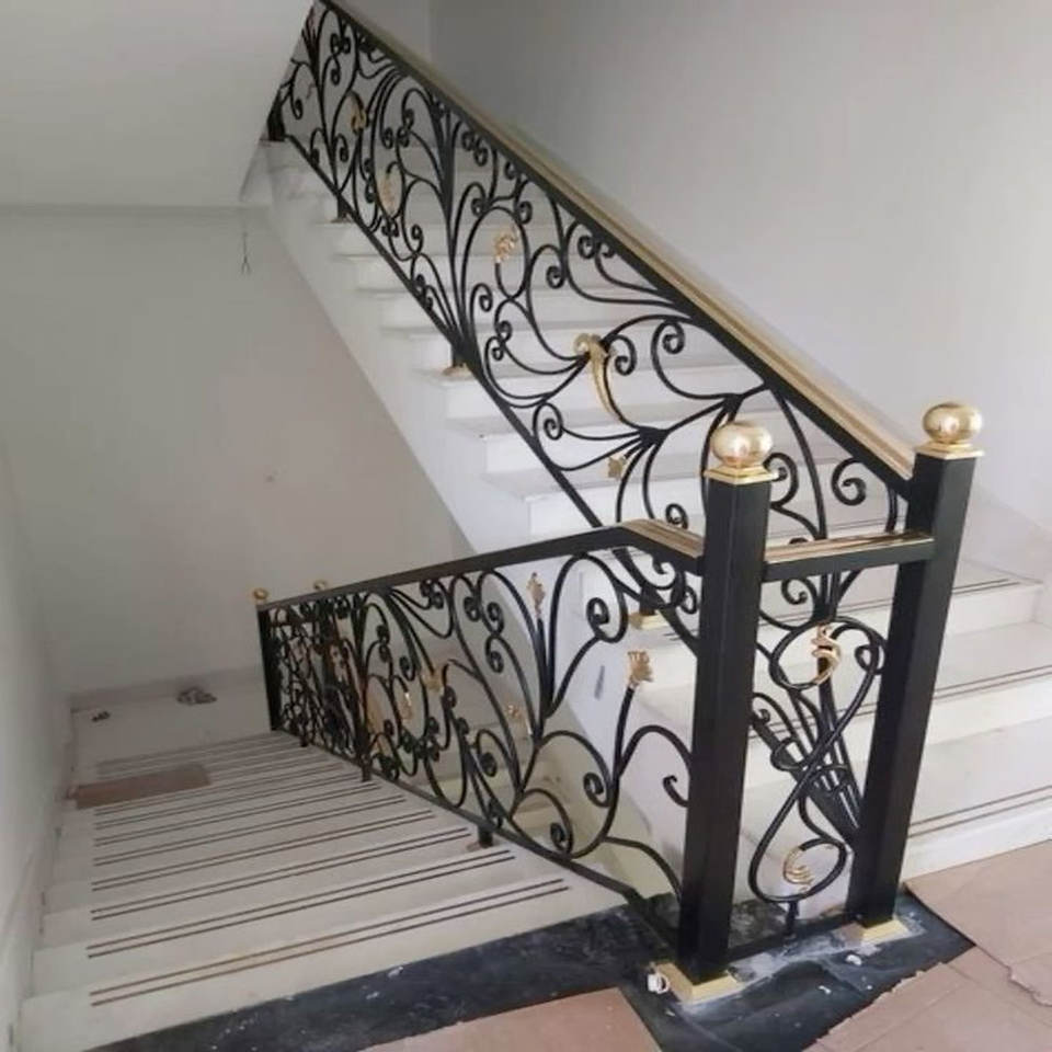 ราวบันไดเหล็กประดับเคลือบด้วยผงและเลื่อนด้วยมือปลอมสำหรับบ้านพรีเมี่ยมและโครงการบันไดตามสั่ง