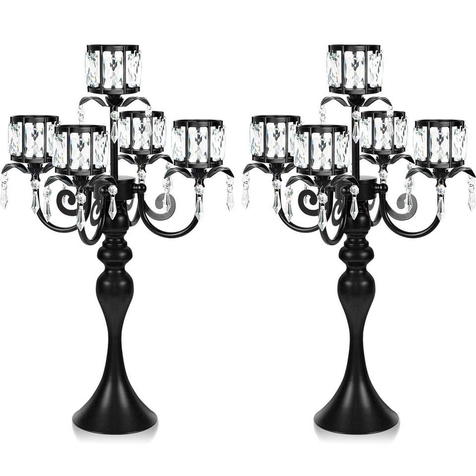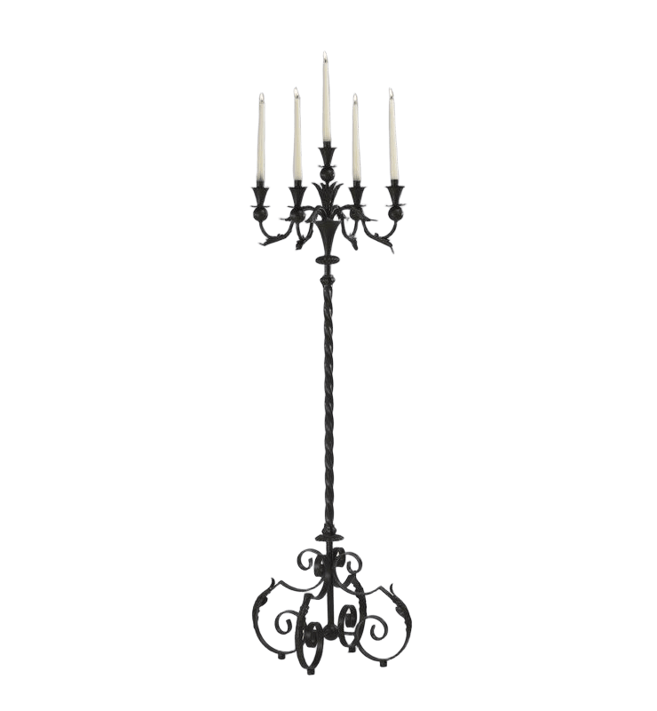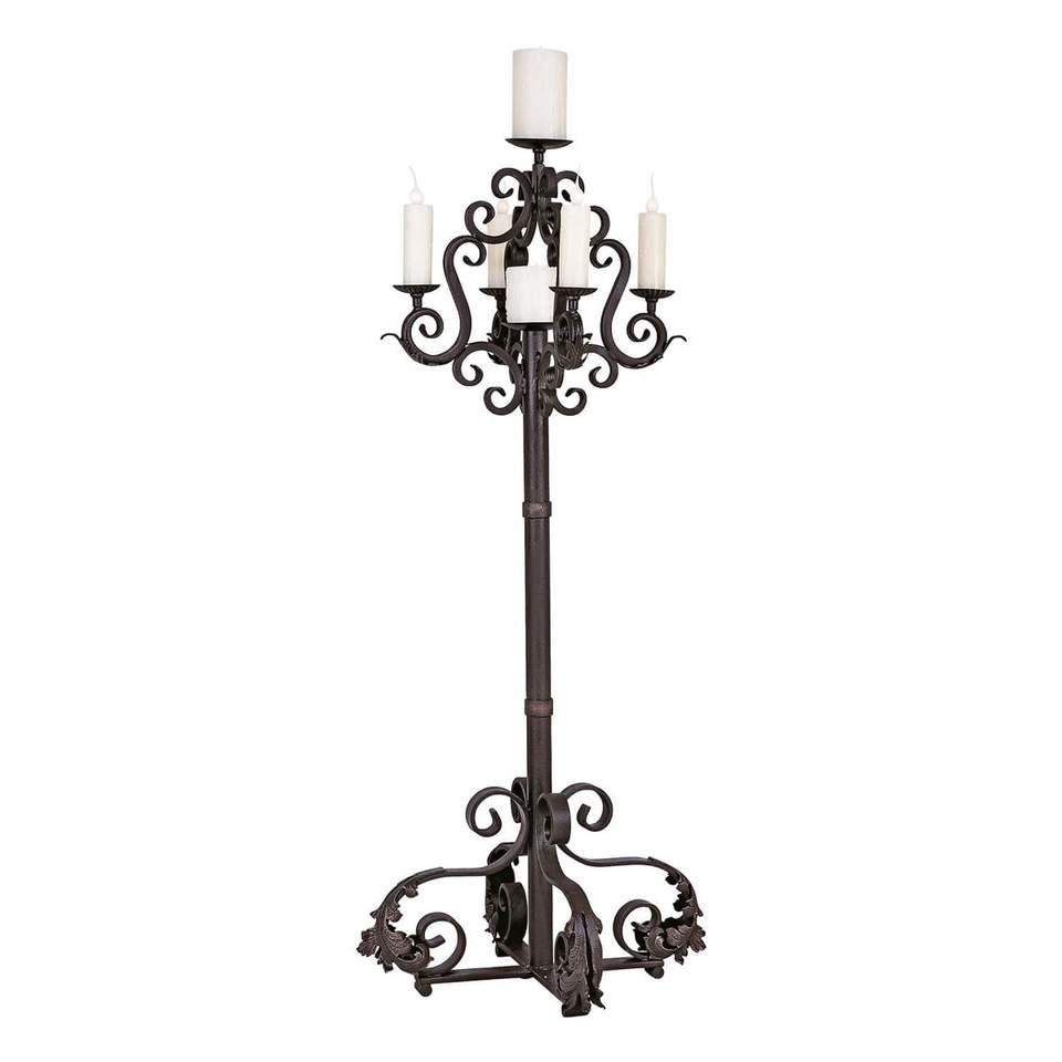 เชิงเทียนเหล็กห้าแขนอันเก่าแก่ที่มีการออกแบบม้วนที่ซับซ้อนสำหรับการตกแต่งบ้านและงานหรูหรา