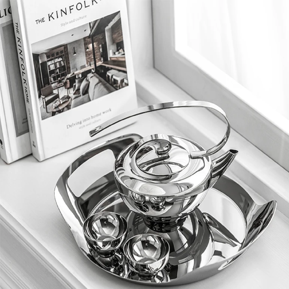 ชุดน้ำชาสีทองหรูหราที่มีผิวค้อนและด้ามจับสีขาวบนถาดเครื่องดื่มคุณภาพสูง