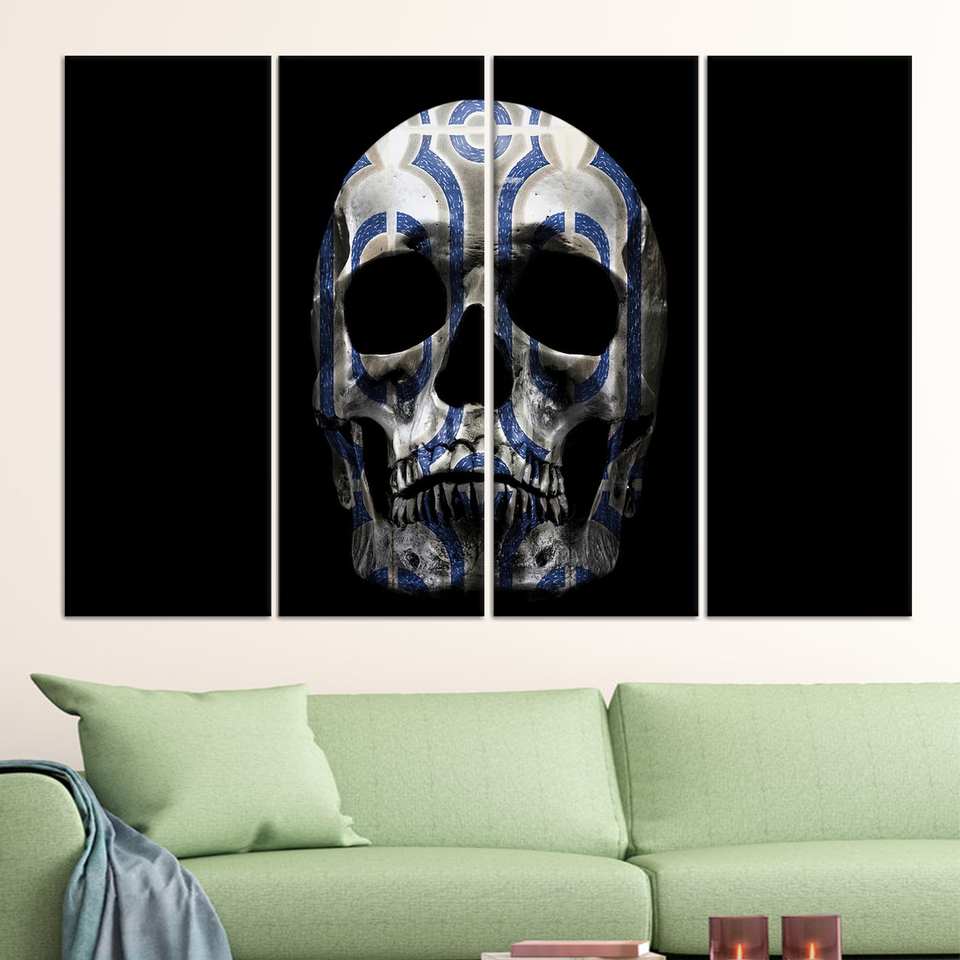 งานศิลปะติดผนังรูปหัวกะโหลกประดับประดา: ภาพพิมพ์แนวสยองขวัญสมัยใหม่บนผ้าใบ ชุดผ้าใบ 4 ชิ้น