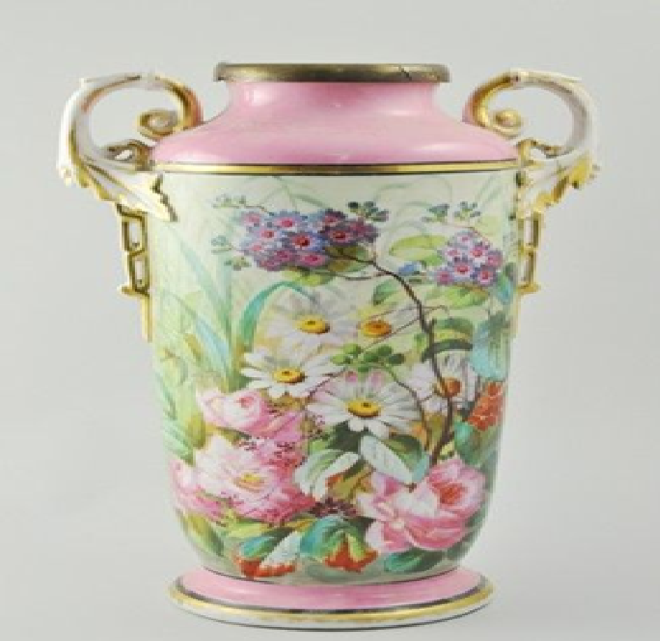 แจกันเซรามิกตกแต่งอย่างหรูหราพร้อมหูจับสีทองและขอบสีชมพูอ่อนลายดอกไม้ในทุ่งนา มีจำหน่ายในราคาขายส่ง