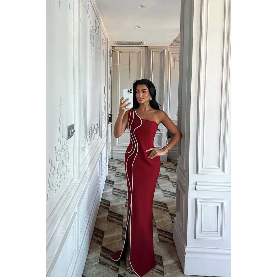 ชุดราตรีออร์สันเบอร์กันดี ทรงบอลกาวน์ ผ่าสูง แต่งลายดอกไม้ 3 มิติ และประดับมุก สำหรับงานปาร์ตี้ ไซส์ XS