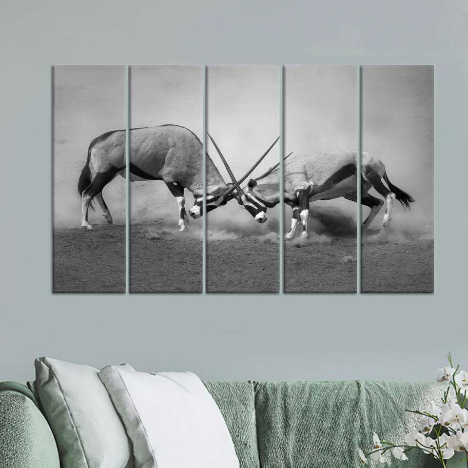 ภาพพิมพ์บนผ้าใบ "การต่อสู้ของกวางโอริกซ์" : ศิลปะสัตว์ป่าแอฟริกันแบบขาวดำ ชุดผ้าใบ 5 ชิ้น