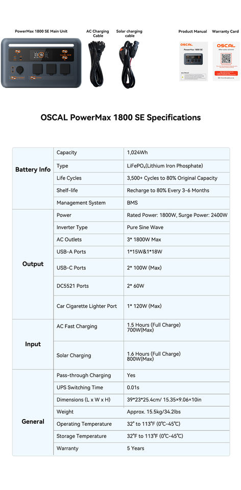 Oscal 1800W สถานีพลังงานแบบพกพา1024WH, เครื่องควบคุม MPPT LiFePO4แบตเตอรี่อินเวอร์เตอร์เพียวไซน์เวฟ1800SE เพาเวอร์แม็กซ์