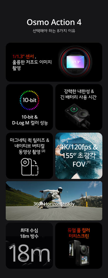กล้องแอคชั่น Osmo Action 4 รุ่นมาตรฐาน ชุดคอมโบ 4K/120fps กันน้ำ พร้อมเซ็นเซอร์ขนาด 1/1.3 นิ้ว รองรับ 10-bit และ D-Log M Color
