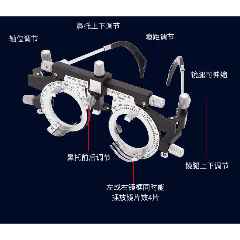 กรอบแว่นทดลองอื่นๆ สำหรับการตรวจสายตา ปรับระยะห่างรูม่านตาได้ 48-80 มม. พร้อมเลนส์เสริมสำหรับการตรวจวัดความสามารถในการมองเห็น