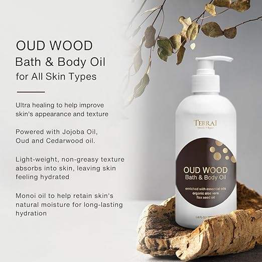 น้ำมันอาบน้ำและบำรุงผิวอูดวู้ด ผสมวิตามินอี น้ำมันเมล็ดแฟลกซ์ และน้ำมันโจโจ้บา ให้กลิ่นหอมผ่อนคลายเพื่อผิวเนียนนุ่มเปล่งปลั่ง