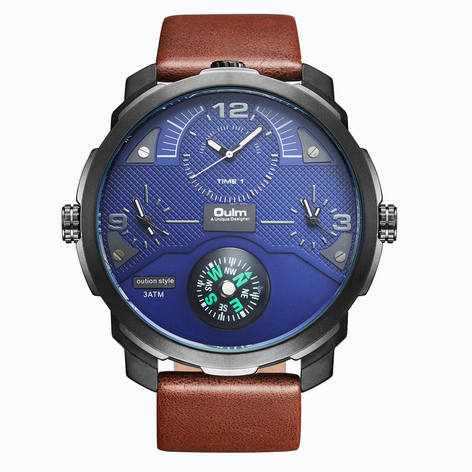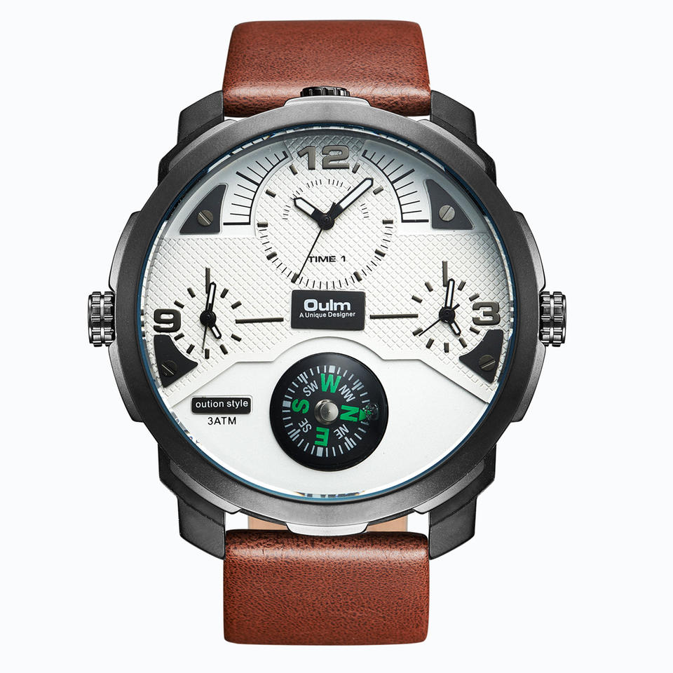 นาฬิกาควอตซ์ Oulm Radium Leisure สำหรับผู้ชาย หน้าปัดขนาดใหญ่ พร้อมเข็มทิศ แสดงหลายเขตเวลา
