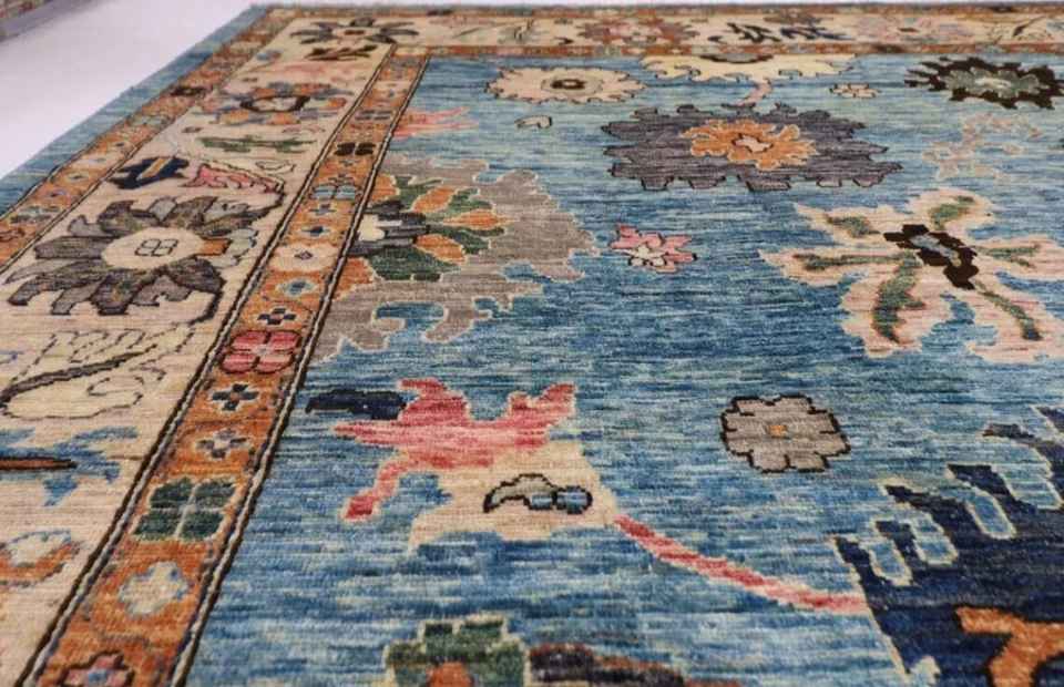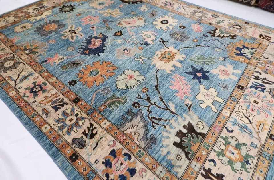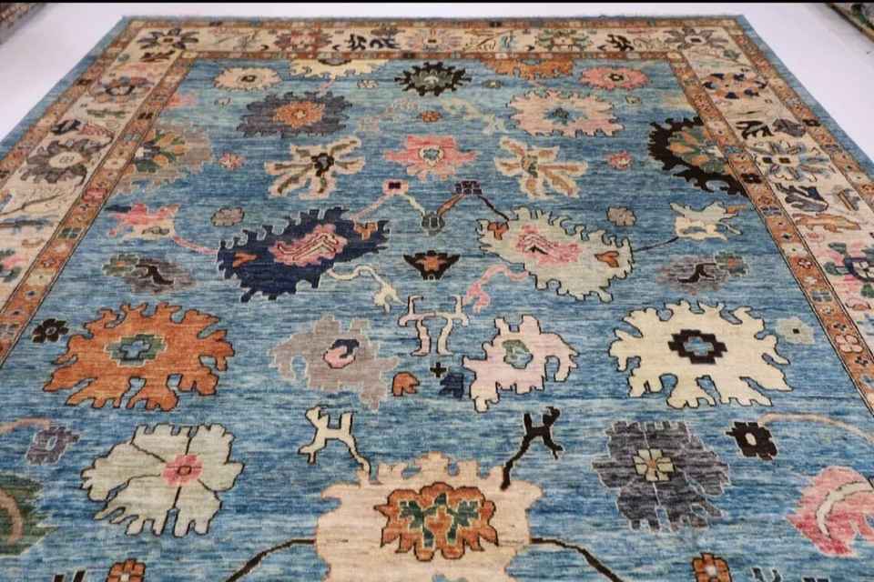 Oushak พรมขนสัตว์10X14ฟุตสีฟ้าพรมทอมือชาวอัฟกานิสถานพื้นที่ห้องนั่งเล่น