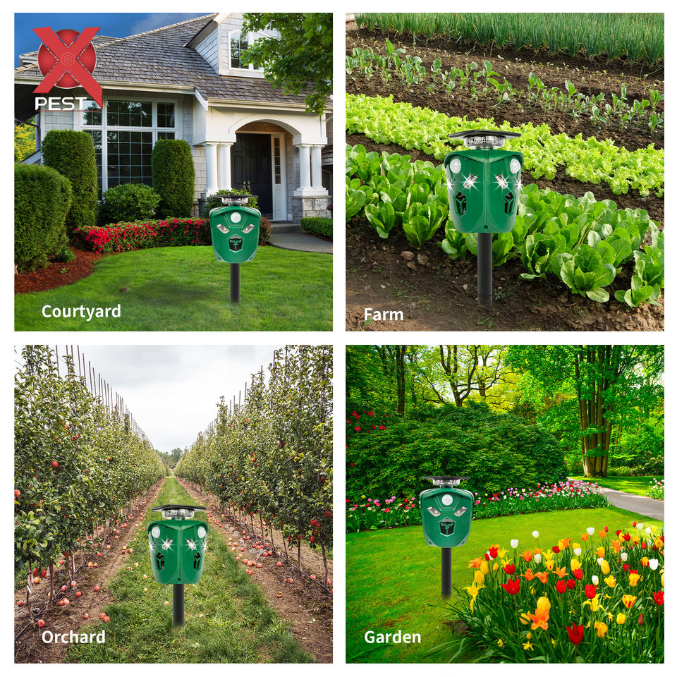 เครื่องไล่สัตว์ด้วยพลังงานแสงอาทิตย์360กลางแจ้งพร้อมไฟกะพริบ LED แรงสูงเครื่องยับยั้งสัตว์ป่าเครื่องไล่ลิงอัลตราโซนิก
