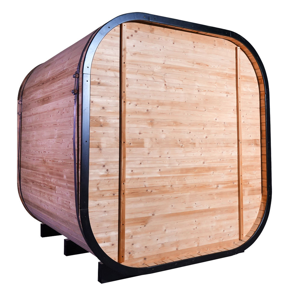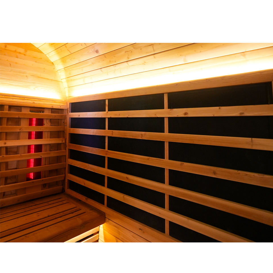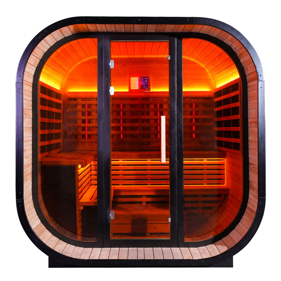 ห้องซาวน่าแห้งแบบไฟฟ้าอินฟราเรดไกล ใช้ไม้ซีดาร์แดงและเฮมล็อก เป็นมิตรกับสิ่งแวดล้อม สำหรับ 4-6 คน ดีไซน์ทันสมัย หลังคาป้องกันฝน