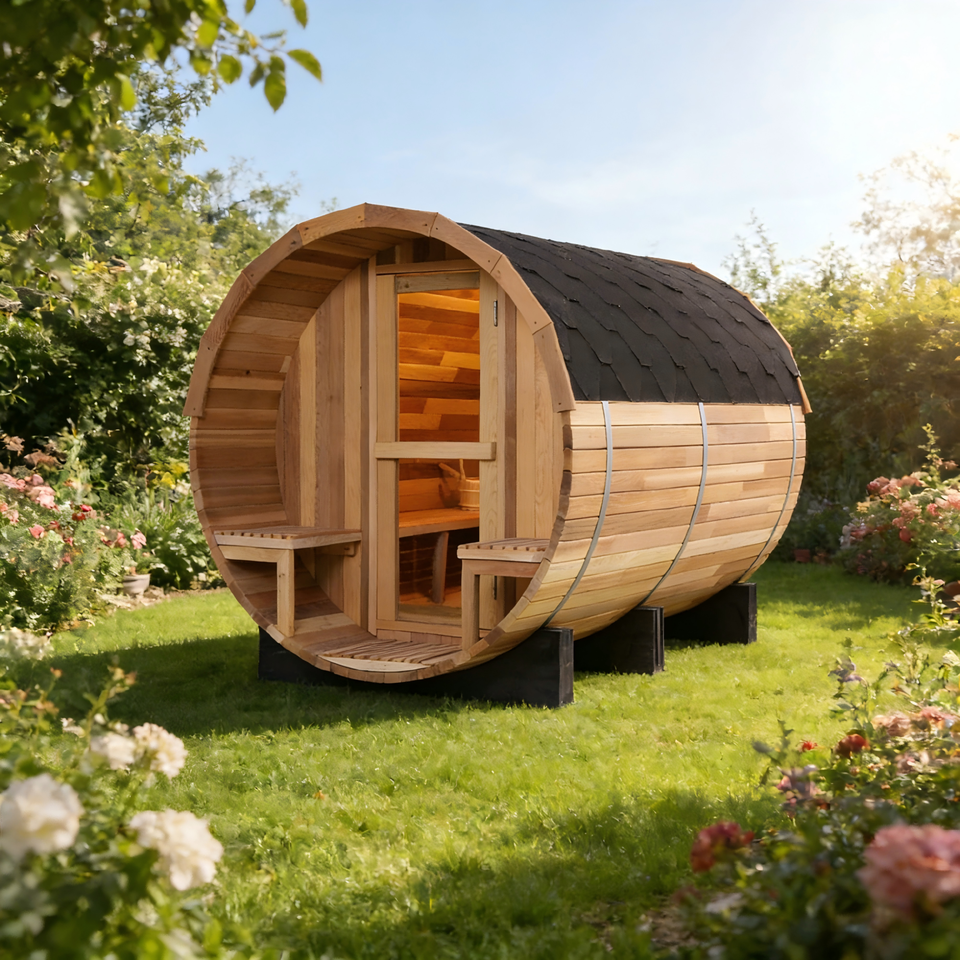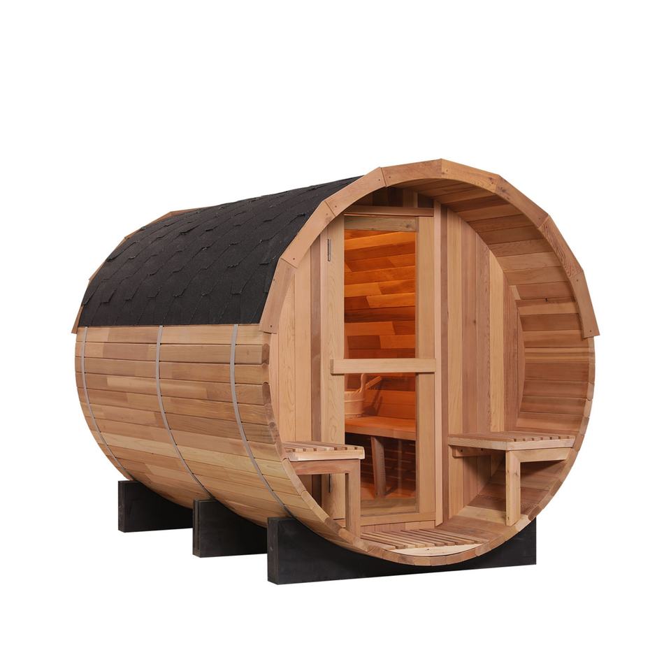 ซาวน่ากลางแจ้งแบบถังไม้ซีดาร์สำหรับ 6 คน พร้อมกระเบื้องกันฝน เตา 6 กิโลวัตต์ และม้านั่ง 2 ตัว