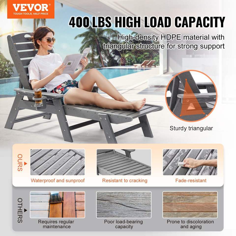 Outdoor 6-Position Adjustable Gray Chaise Lounge Chair Reclining Sun Lounger Bench