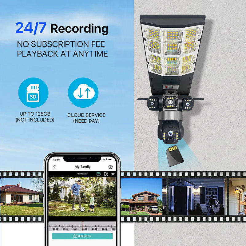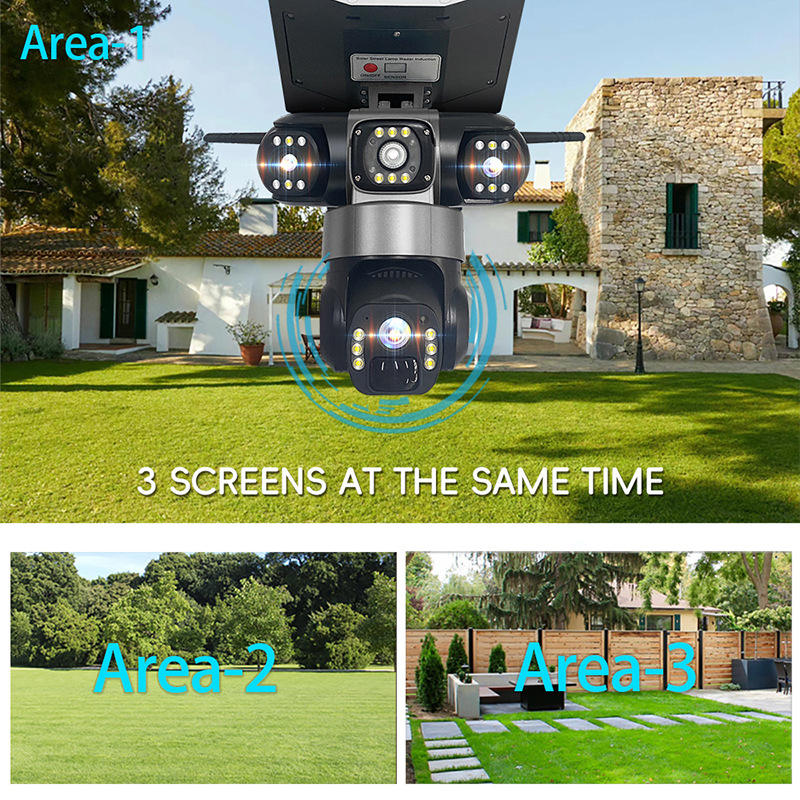 กล้องวงจรปิดรักษาความปลอดภัยกลางแจ้ง 6MP IP66 3 เลนส์ 3 PTZ กล้องมองกลางคืนพลังงานแสงอาทิตย์ V380Pro WiFi 4G กล้องวงจรปิดพลังงานแสงอาทิตย์พร้อมไฟถนน