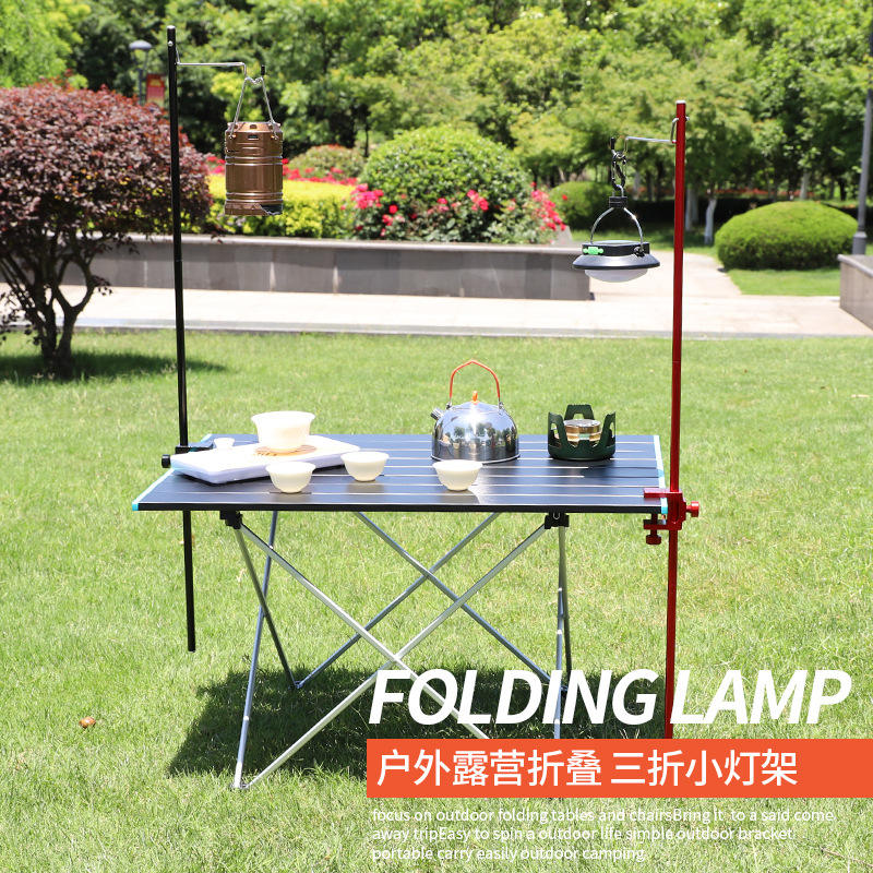 ขาตั้งโคมไฟพับได้อลูมิเนียมอัลลอยด์สำหรับใช้งานกลางแจ้ง ขนาด 90 ซม. โต๊ะพับสามตอนแบบพกพาสำหรับตั้งแคมป์ พร้อมเสาแขวนไฟ