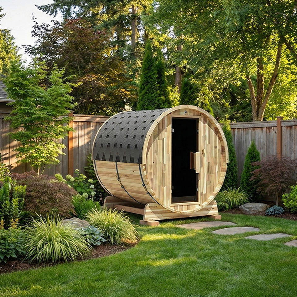 ห้องซาวน่ากลางแจ้งแบบถังทรงกระบอก สำหรับ 4 คน พร้อมเครื่องทำความร้อน 6 กิโลวัตต์ แบบดั้งเดิม ใช้ไอน้ำแห้ง พร้อมหลังคาทรงจั่ว
