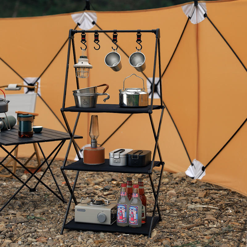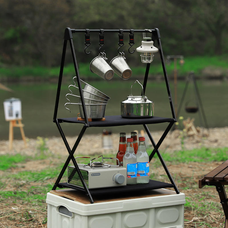 ชั้นวางของอลูมิเนียมพับได้สำหรับตั้งแคมป์กลางแจ้ง พร้อมตะขอแขวนเพื่อการจัดเก็บที่เป็นระเบียบและพกพาสะดวก