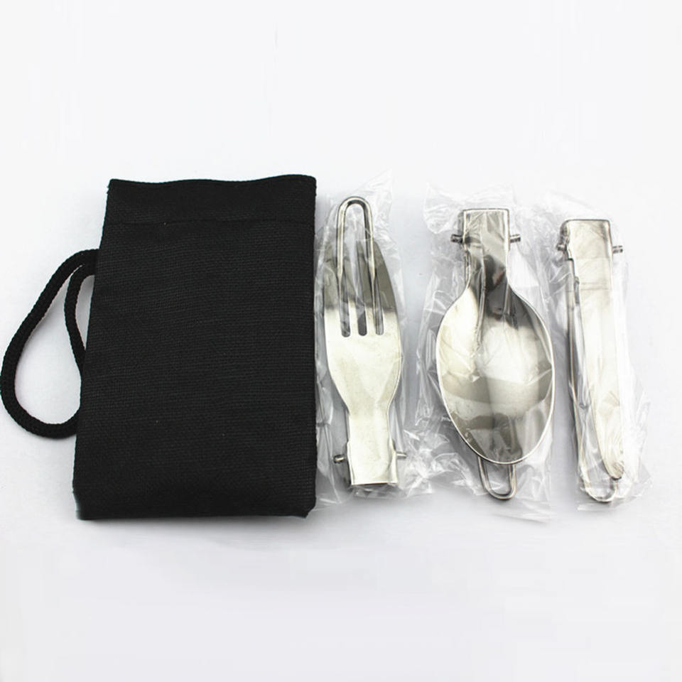 ชุดช้อนส้อมสแตนเลสพับได้สำหรับตั้งแคมป์กลางแจ้ง ชุดมีดส้อมช้อนพกพาพร้อมกระเป๋าใส่ สีเงิน