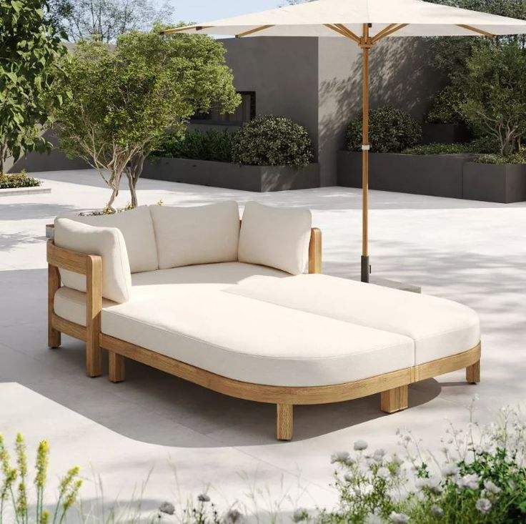 โซฟาเดย์เบดกลางแจ้งพร้อมโครงไม้สักแท้ ดีไซน์โค้งมนแบบมินิมอล พร้อมเบาะรองนั่งทนทานต่อสภาพอากาศ และพื้นที่พักผ่อนสุดหรู