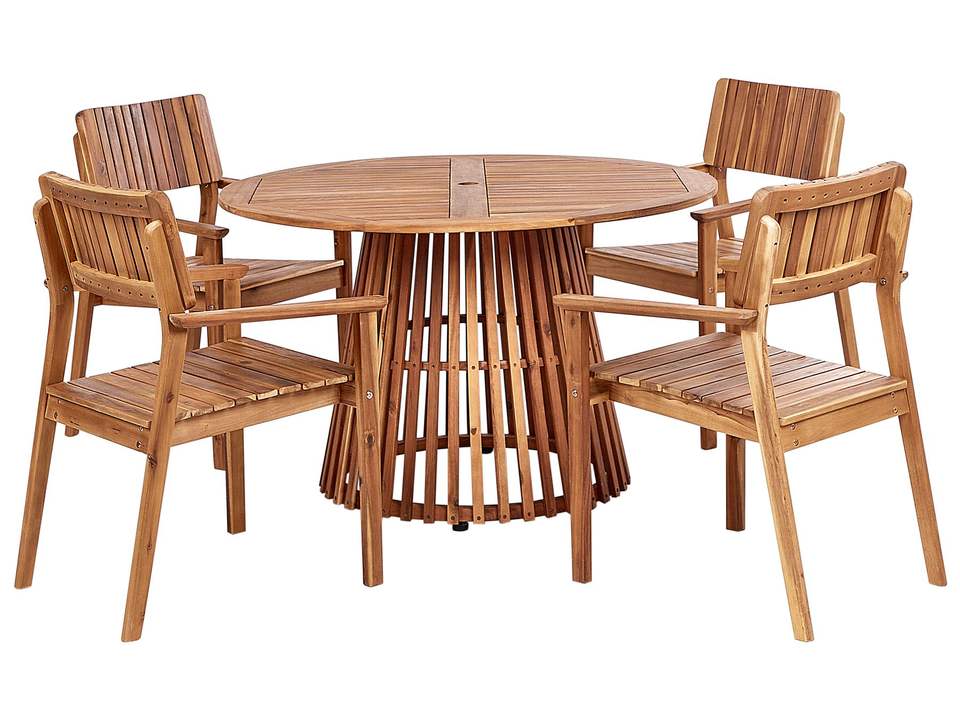 ชุดโต๊ะอาหารพับได้ทำจากไม้กระถินเทศ ยี่ห้อ Erina ให้ความรู้สึกสบายตา เป็นมิตรกับสิ่งแวดล้อม เหมาะสำหรับใช้กลางแจ้ง ที่โรงเรียน/อพาร์ตเมนต์ โรงแรม ลานบ้าน และสวนสาธารณะ