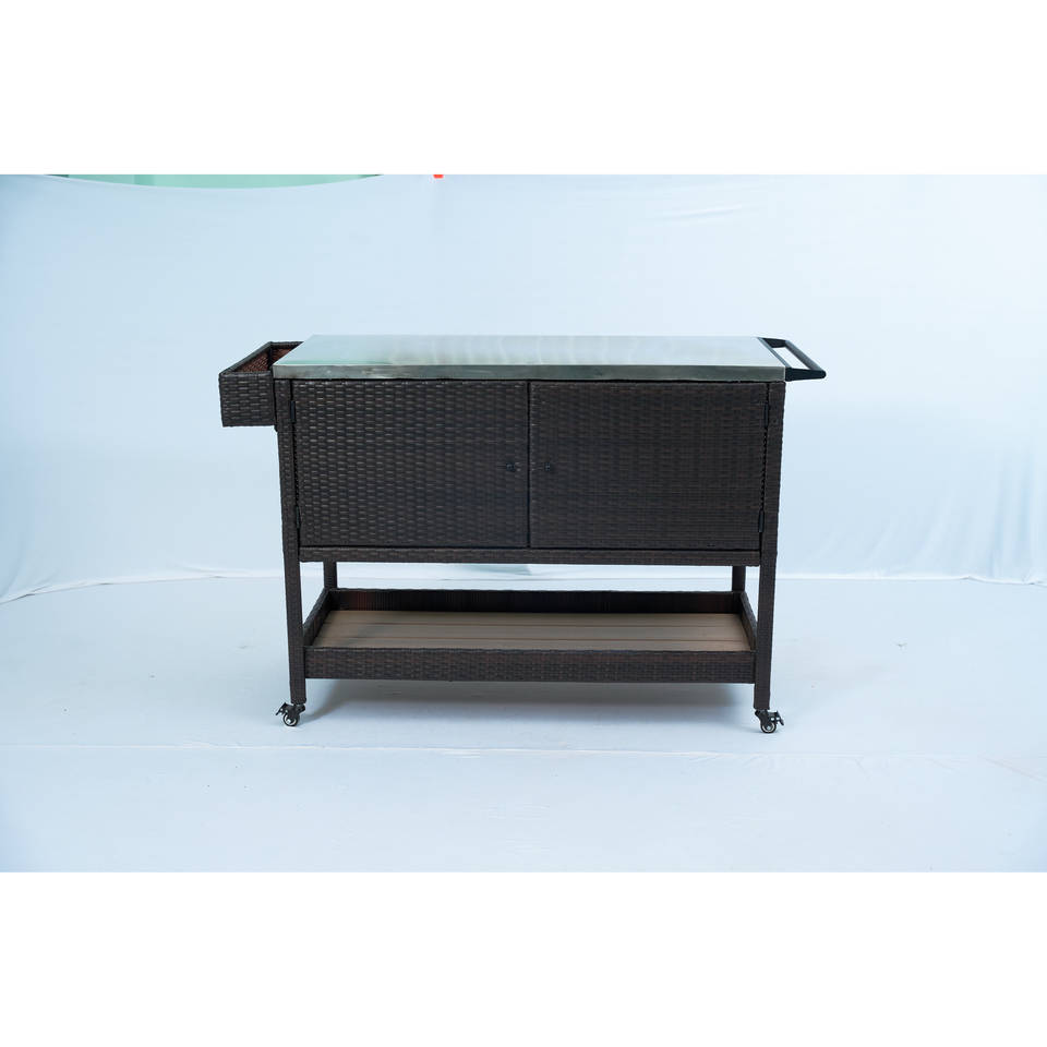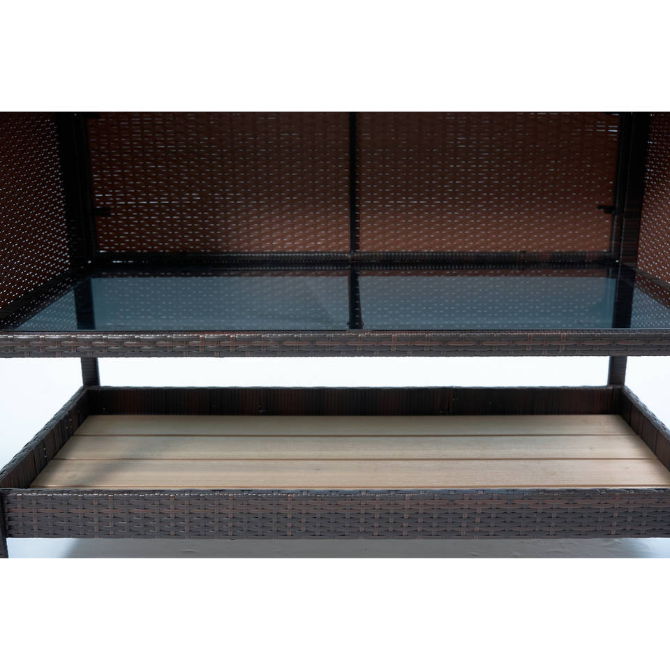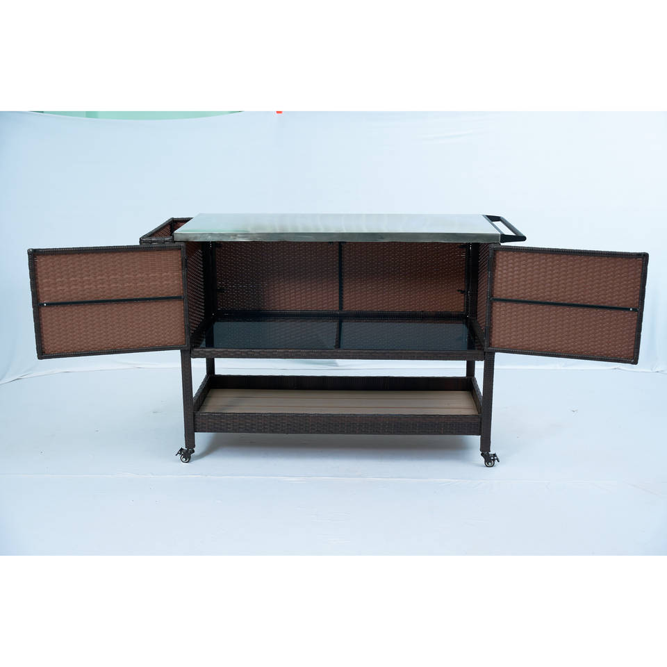 Outdoor Double-Door Rolling Storage Cabinet PE Rattan Wicker with Glass Top for Outdoor Storage
