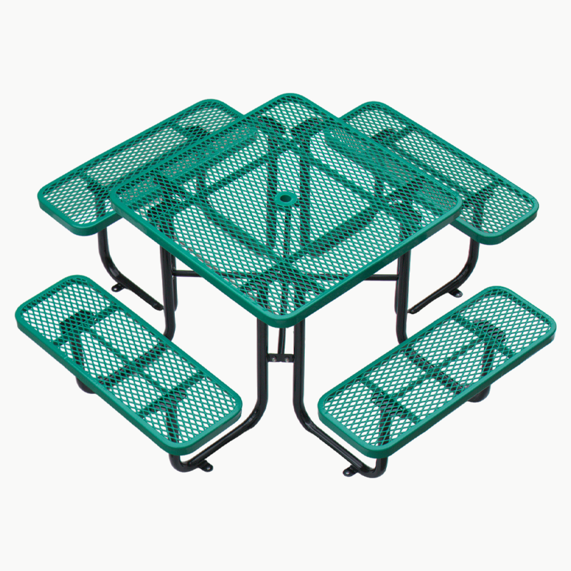 โต๊ะปิกนิกเหล็กกล้าทรงกลม/สี่เหลี่ยมสำหรับใช้งานกลางแจ้ง พร้อมม้านั่ง เฟอร์นิเจอร์ระเบียงกลางแจ้ง โต๊ะรับประทานอาหารโลหะทันสมัยพร้อมเก้าอี้