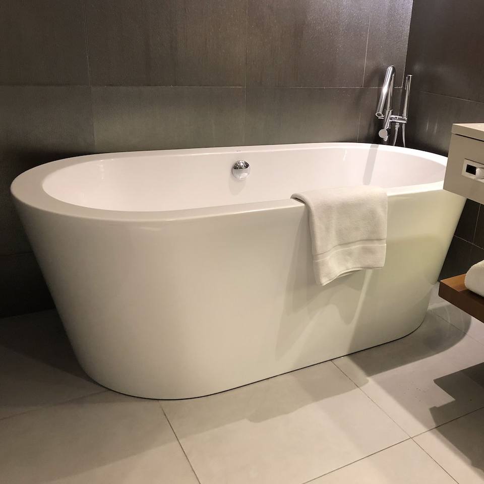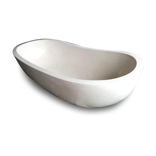อ่างอาบน้ำแบบตั้งพื้นกลางแจ้ง ดีไซน์ทันสมัย ทำจากเรซิ่นเทอร์ราซโซ รูปทรงวงรี พร้อมที่วางแขนและท่อระบายน้ำมุม สำหรับใช้ในโรงแรม
