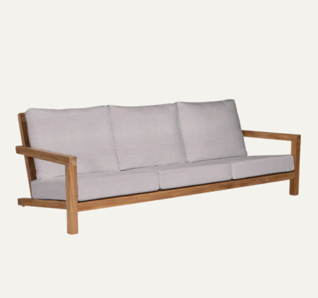 โซฟาไม้สักสำหรับสวนกลางแจ้ง โครงไม้เนื้อแข็ง พร้อมเบาะหนานุ่ม ทนทานต่อสภาพอากาศ เหมาะสำหรับห้องนั่งเล่นสไตล์ทรอปิคอล ระเบียงบ้านพักตากอากาศ วิลล่า โรงแรม รีสอร์ท