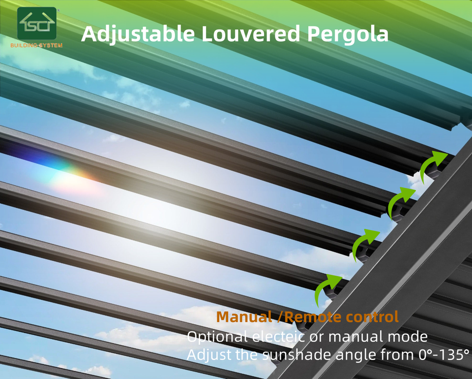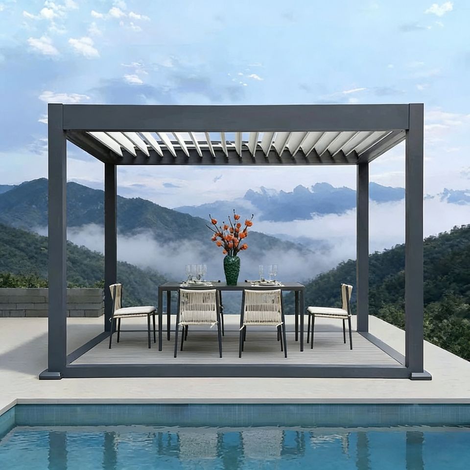 เพอร์โกล่าอะลูมิเนียมแบบบานเกล็ดปรับได้ด้วยมอเตอร์ ควบคุมด้วยระบบไบโอคลิเมติก