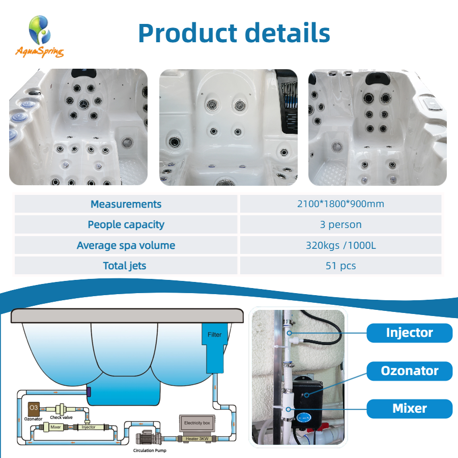 สปาอุ่นกลางแจ้งขนาด2.1เมตรอ่างน้ำวนด้านนอกอ่างน้ำร้อน3คนอ่างสปาร้อนที่บ้านพร้อมเครื่องนวด51ตัว