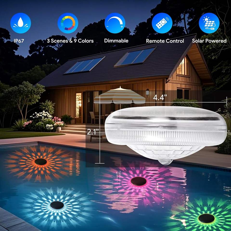 ไฟ LED สระว่ายน้ำพลังงานแสงอาทิตย์แบบลอยน้ำได้สำหรับตกแต่งสระว่ายน้ำกลางแจ้ง IP67กันน้ำได้หลากสี RGB