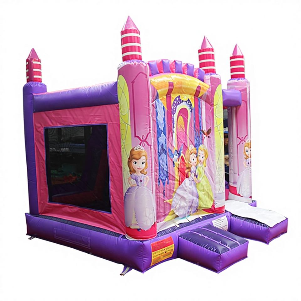 บ้านลมเป่าลมกลางแจ้งรูปเจ้าหญิงพร้อมสไลเดอร์และแทรมโพลีน ได้รับการรับรองมาตรฐาน CE ปรับแต่งขนาด/สีได้ ติดตั้งง่าย