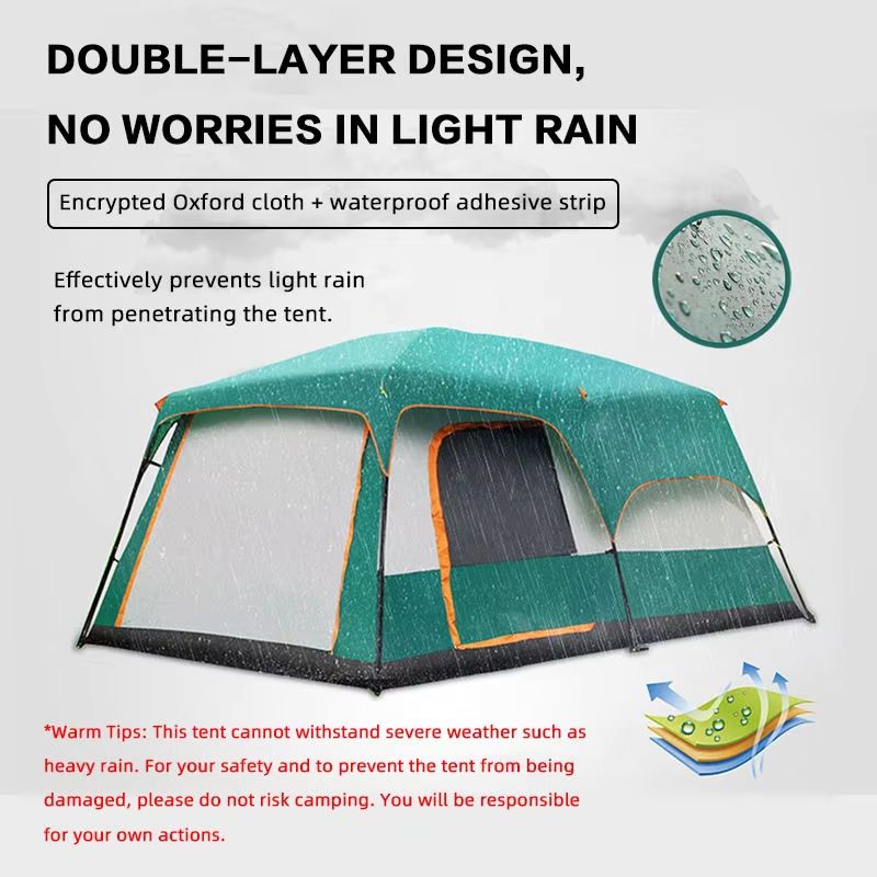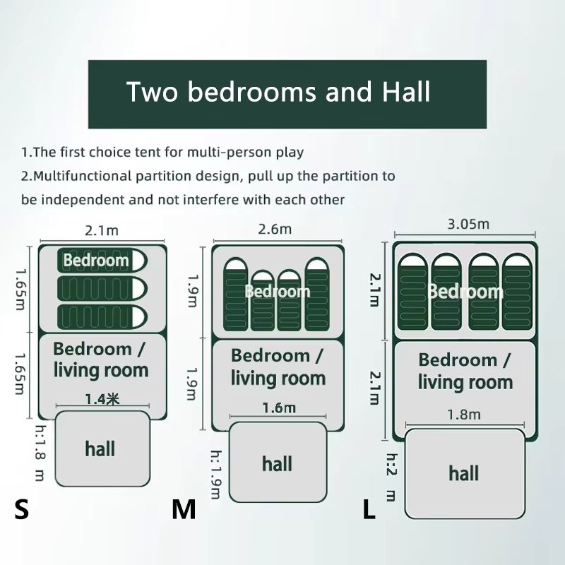 เต็นท์แคมป์ปิ้งสำหรับครอบครัวขนาดใหญ่กลางแจ้ง หลายประตู พร้อมหน้าต่างพาโนรามา แบ่งเป็น 3 ห้อง มีหลังคาบังแดดแบบถอดได้