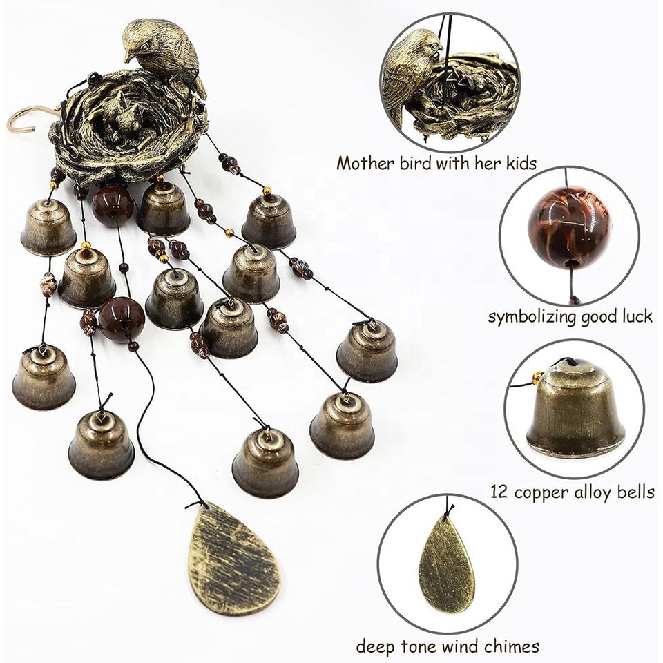 ของตกแต่งสวนโลหะกลางแจ้ง สีทองแดง รูปนกแขวนประดับ รังนกเรซิ่น ตัวหมุนลม กระดิ่งทองเหลือง โมบายลม