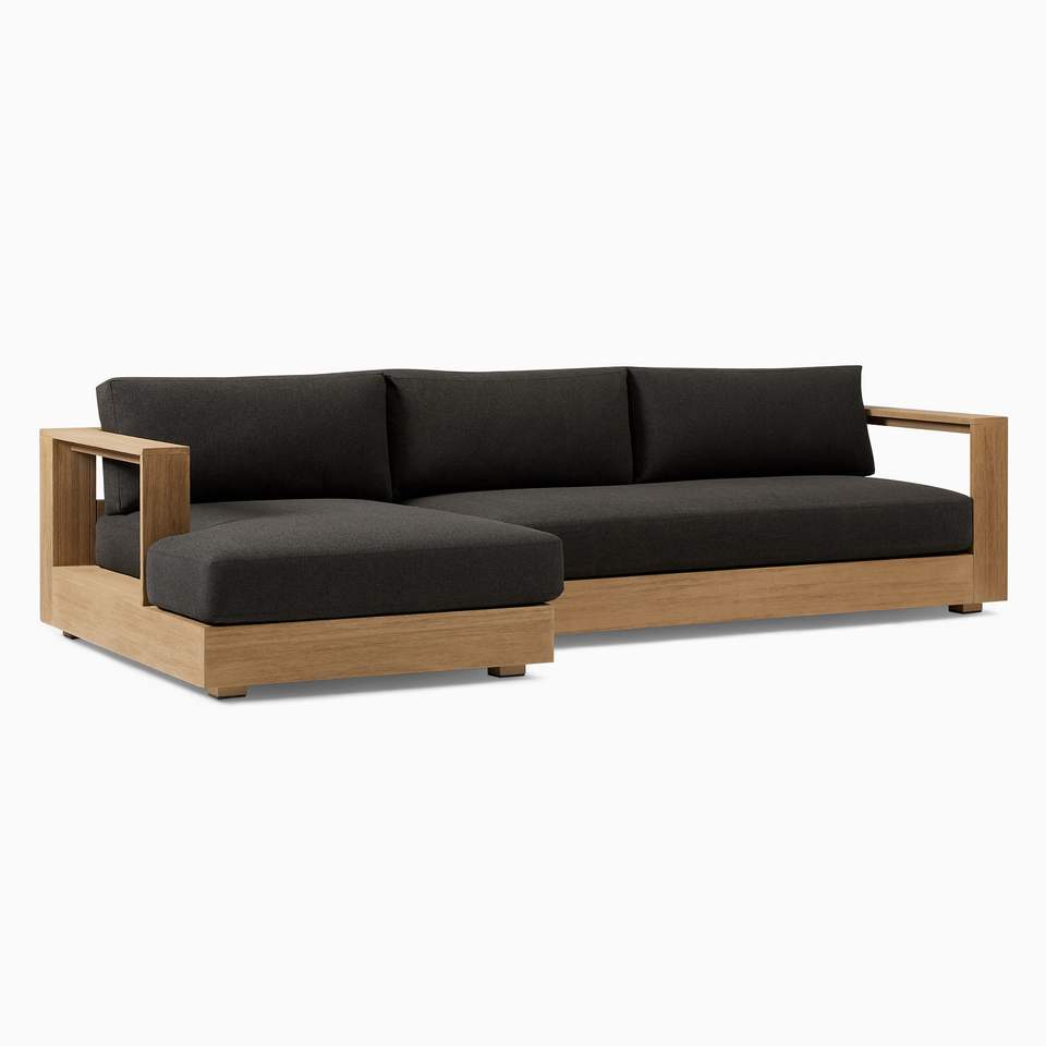 โซฟากลางแจ้งทันสมัยส่วนรูปตัว L วัสดุไม้สักแข็งหรูหราโซฟารูปตัว L เฟอร์นิเจอร์นั่งเล่นกลางแจ้ง