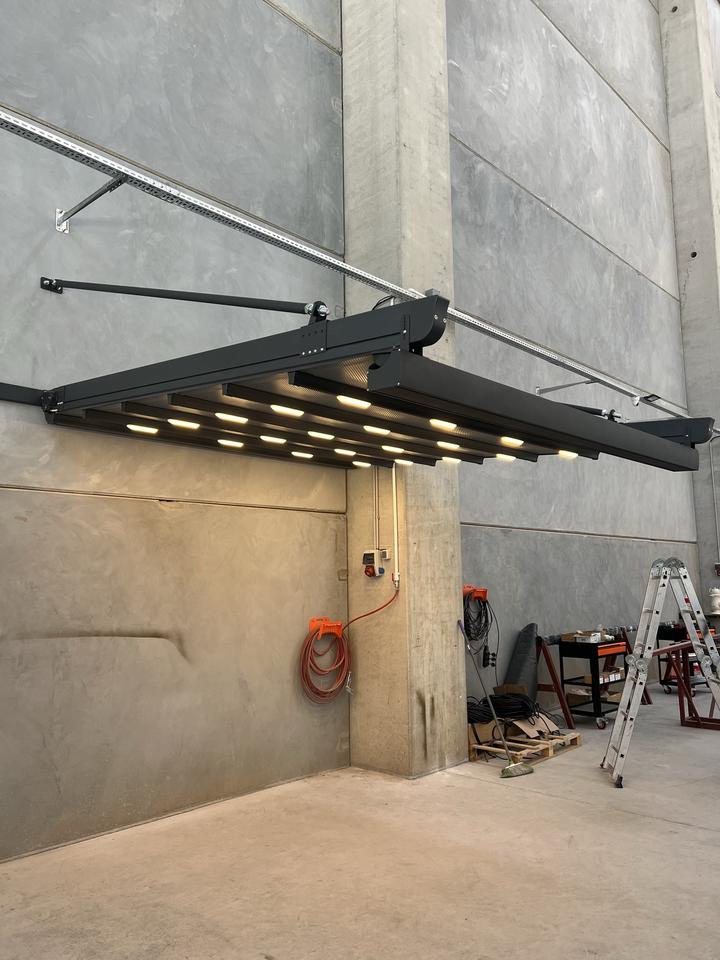 หลังคาผ้าใบพีวีซีแบบมอเตอร์สำหรับภายนอกอาคาร แบบยืดหดได้ พร้อมไฟ LED ปรับความสว่างได้ ระบบเพอร์โกลาอะลูมิเนียม