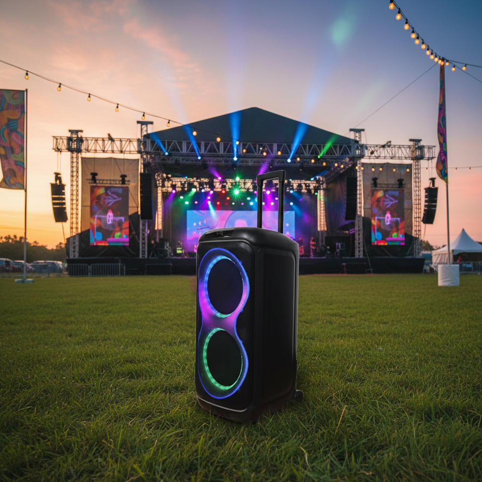 ลำโพงคาราโอเกะแบบพกพาสำหรับงานปาร์ตี้กลางแจ้ง รุ่น Double 10 นิ้ว RGB Tower DJ 60W LED พร้อมไมโครโฟนไร้สาย รองรับแบตเตอรี่ในตัว
