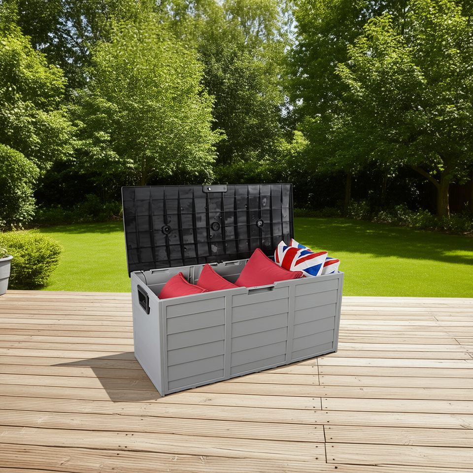 กล่องเก็บของพลาสติกสำหรับกลางแจ้ง ขนาด 75 แกลลอน พร้อมกุญแจล็อค สำหรับเก็บเครื่องมือ เบาะรองนั่ง ของเล่น และที่นั่ง