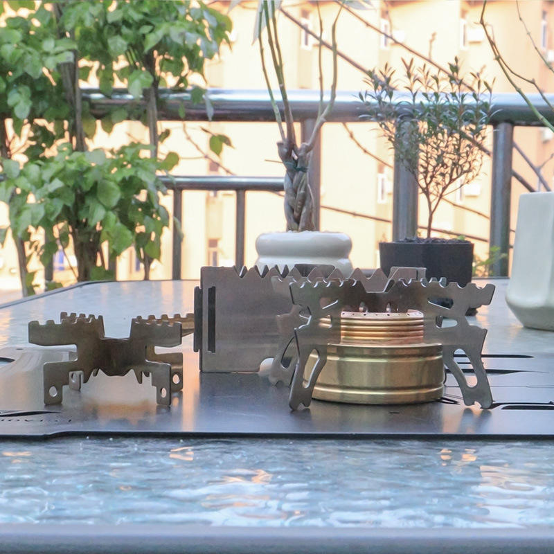 เตาแอลกอฮอล์แบบพกพาสำหรับใช้งานกลางแจ้ง พร้อมขาตั้งสแตนเลส ทนทาน ใช้เชื้อเพลิงแข็ง เหมาะสำหรับตั้งแคมป์ ดีไซน์เรียบง่าย น้ำหนักเบา พับเก็บได้