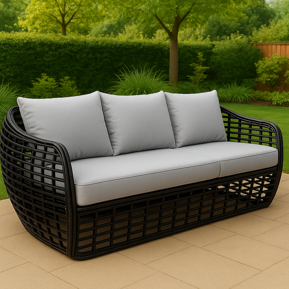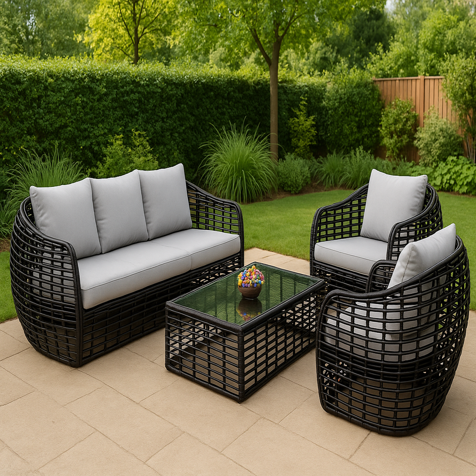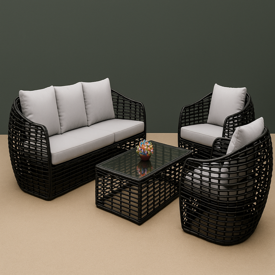 ชุดโซฟาหวายกลางแจ้งพร้อมเบาะรองนั่งนุ่มๆและโต๊ะกระจกด้านบนเหมาะสำหรับสวนหลังบ้านระเบียงหรือเฉลียง