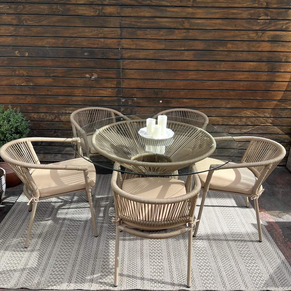ชุดโต๊ะอาหารและเก้าอี้หวายกลางแจ้งสไตล์โรงแรมทันสมัยพร้อมกรอบอลูมิเนียมเฟอร์นิเจอร์ในสวนที่ทนทานต่อรังสียูวี