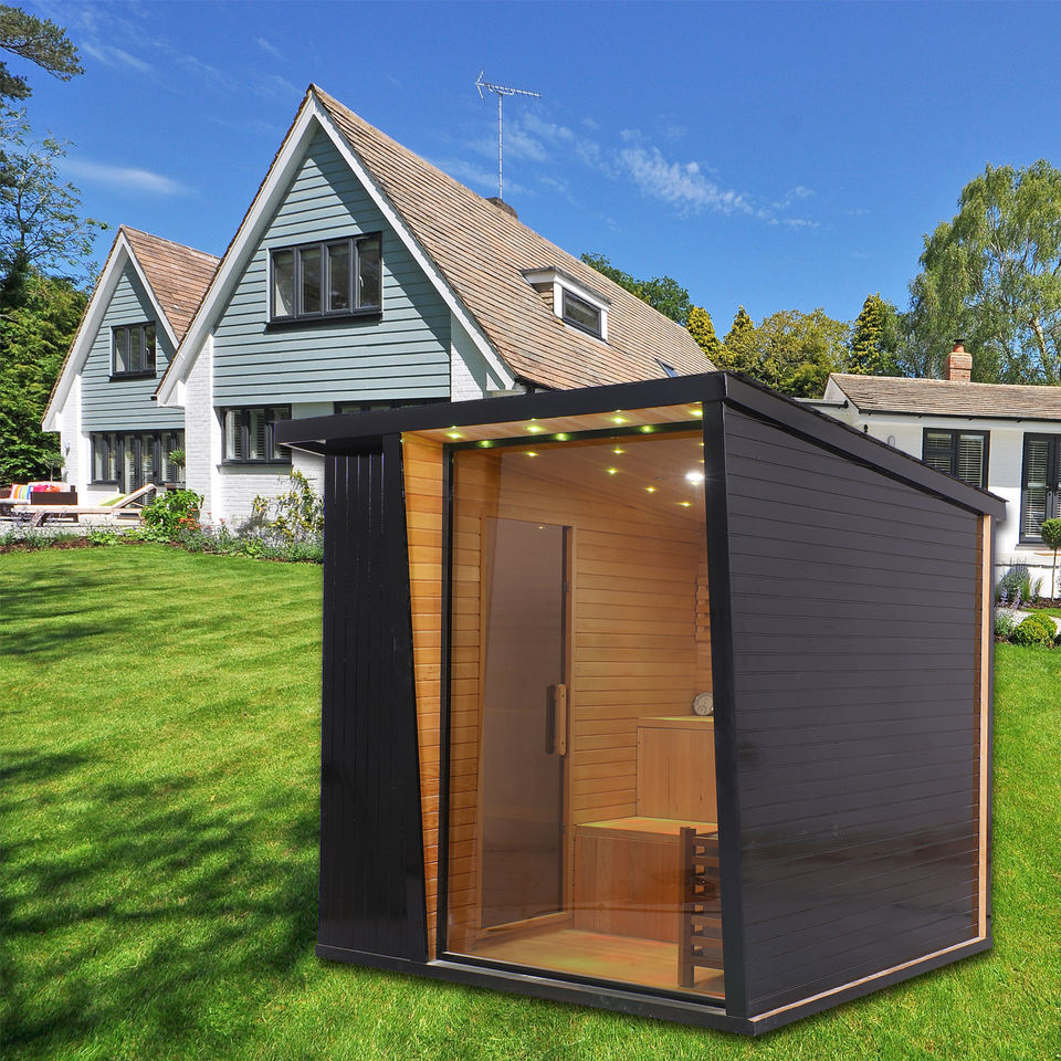 ห้องซาวน่ากลางแจ้งสำหรับ 4 คน ทำจากไม้ซีดาร์แดง พร้อมเตาซาวน่า 6.0 กิโลวัตต์ สีดำ ดีไซน์รักษ์โลก เหมาะสำหรับสวนหลังบ้านวิลล่า