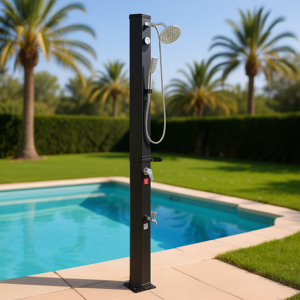 ฝักบัวกลางแจ้งสูง 6.7 ฟุต พร้อมฝักบัวมือถือและก๊อกน้ำแบบเท้าเหยียบสำหรับใช้ริมสระน้ำ ปรับน้ำร้อนน้ำเย็นได้