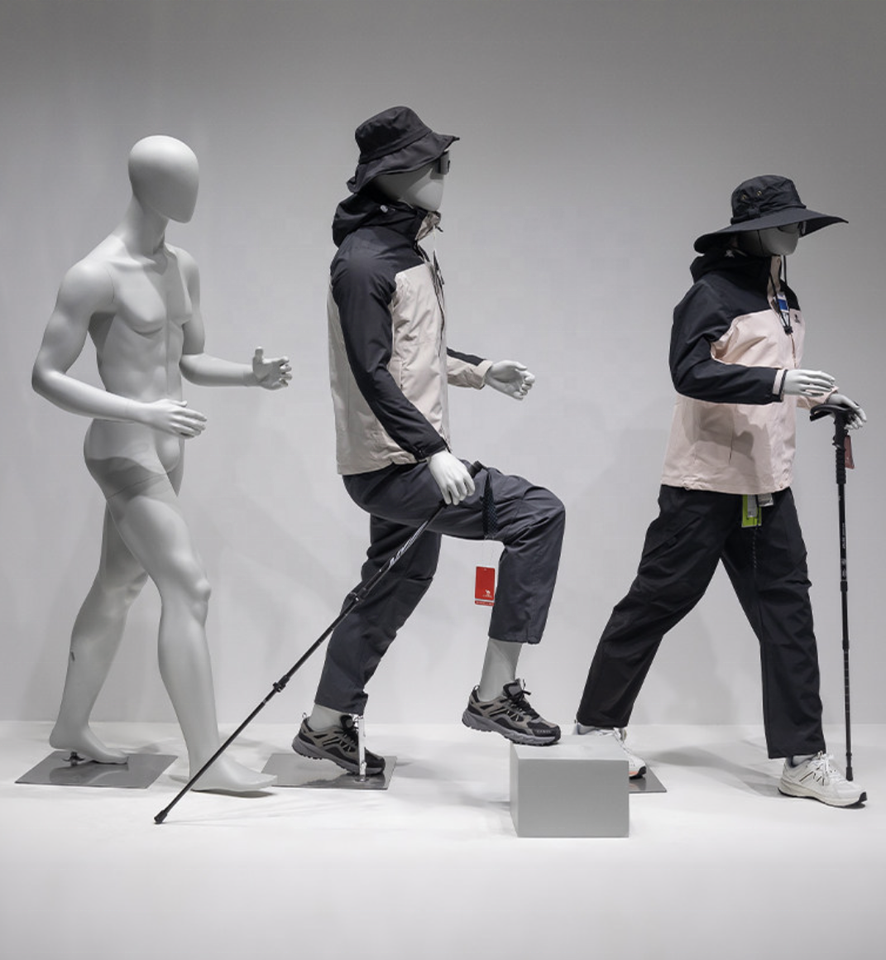 หุ่นจำลองกีฬากลางแจ้งแบบเต็มตัว หุ่นจำลองเดินป่าแบบด้าน หุ่นจำลองปีนเขาชายหญิง สำหรับโชว์เสื้อแจ็คเก็ตและเสื้อโค้ท