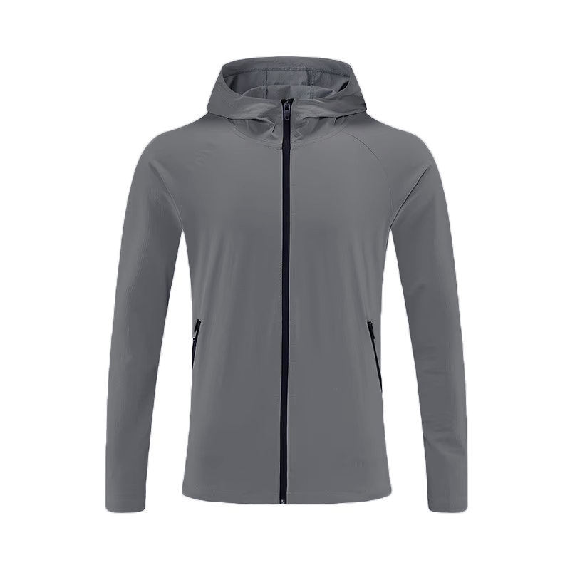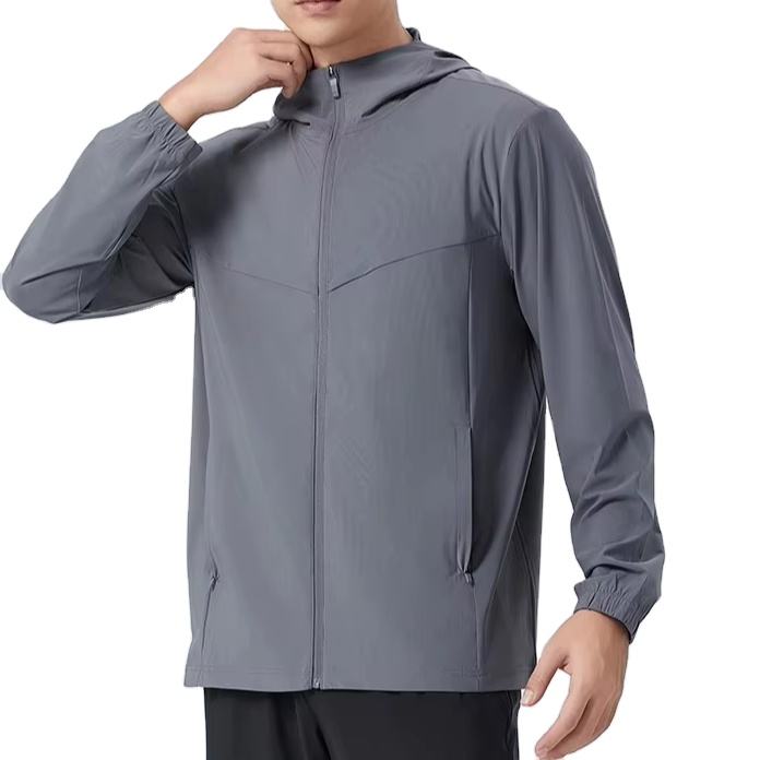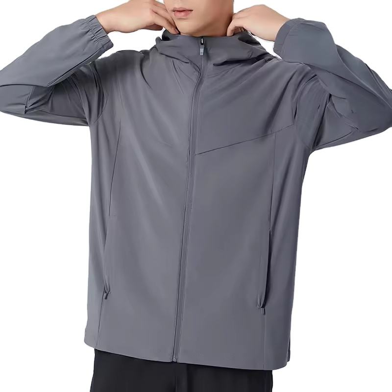 เสื้อโค้ทกีฬากลางแจ้งแห้งเร็วเสื้อฮู้ดสำหรับผู้ชายน้ำหนักเบาแบบพกพากันน้ำย้อมสีพื้น