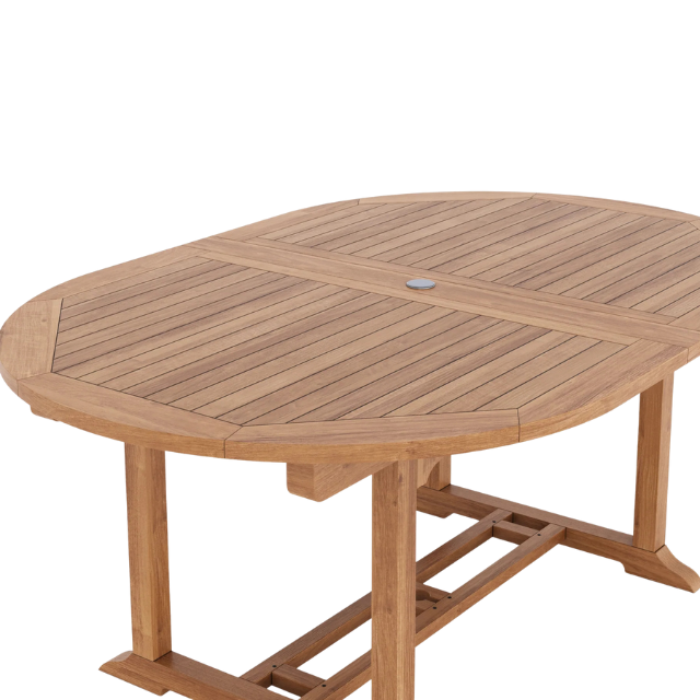 ชุดรับประทานอาหารไม้สักกลางแจ้งพร้อมโต๊ะวงรีขยายได้และเก้าอี้เท้าแขนแบบผสมพร้อมเบาะรองนั่ง