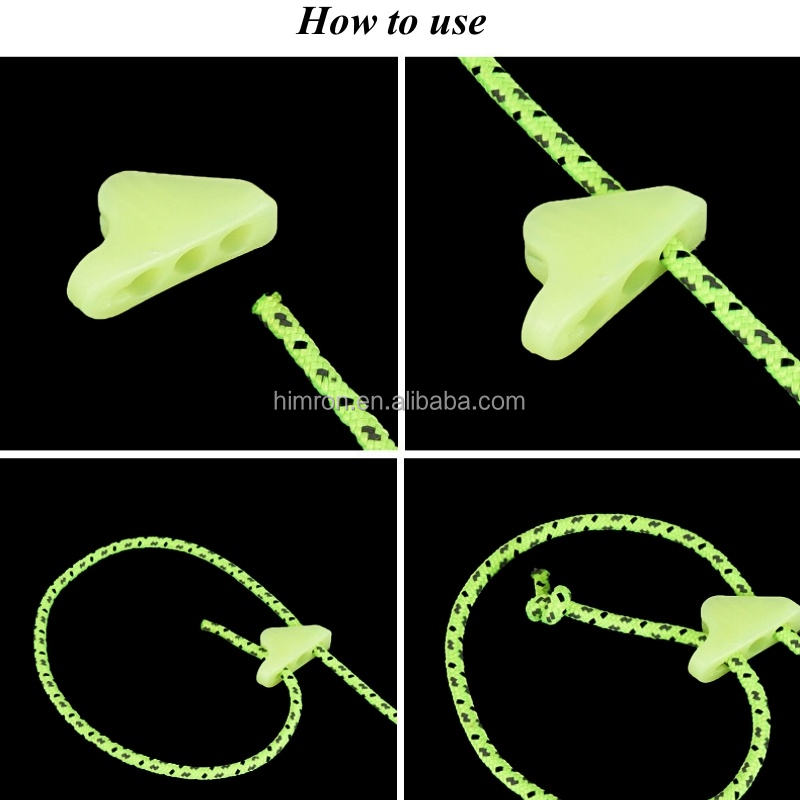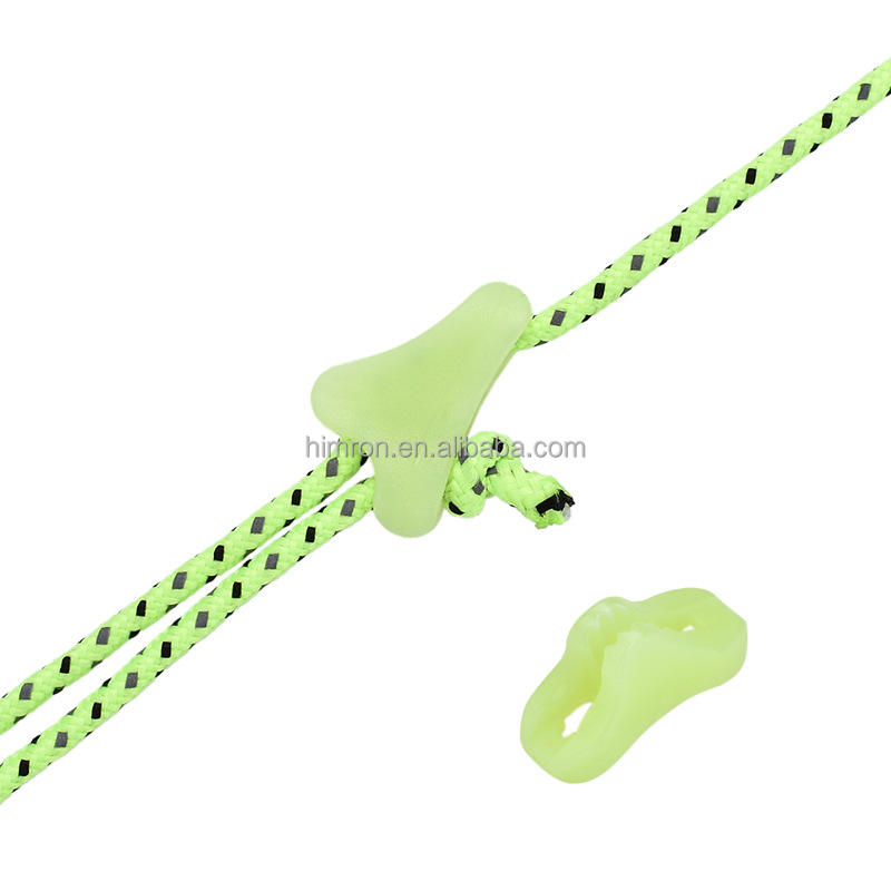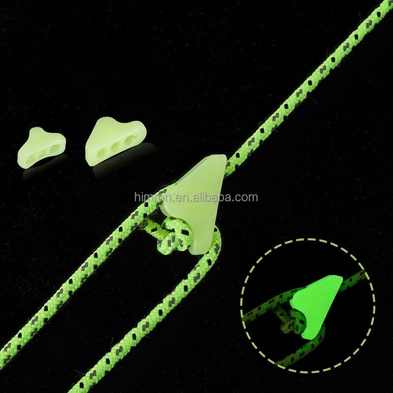 ตัวยึดเชือกพลาสติกสำหรับเต็นท์กลางแจ้งตัวปรับเชือกหัวเข็มขัดสามเหลี่ยมเรืองแสงในที่มืดในเวลากลางคืน