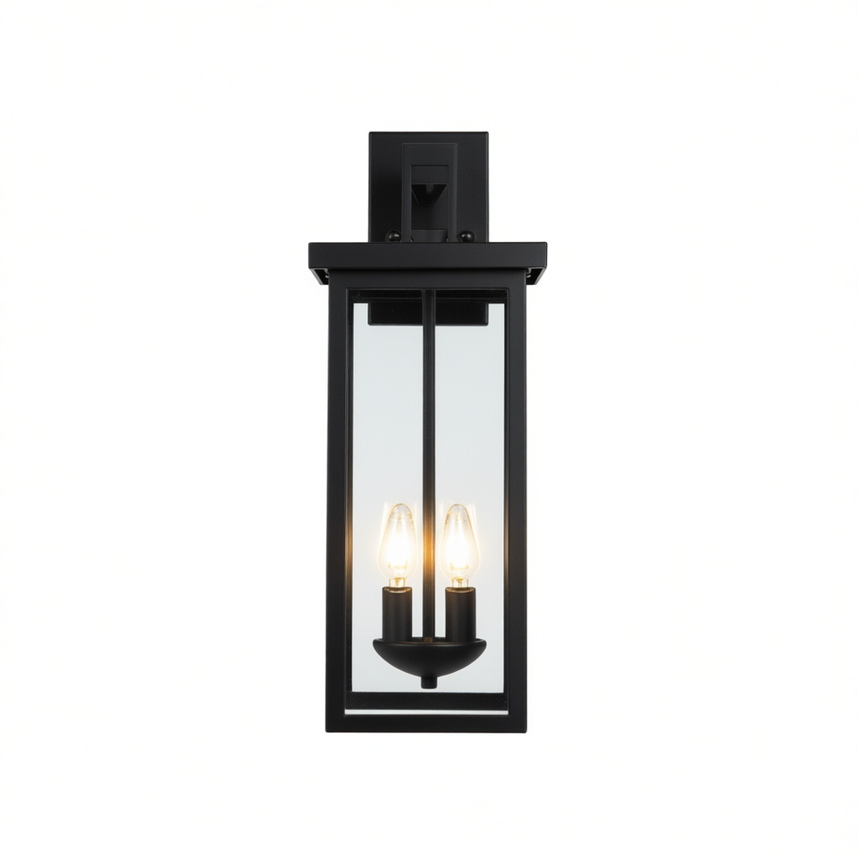 โคมไฟติดผนังภายนอกอาคาร สีดำด้าน กระจกใส 2 ดวง พร้อมเซ็นเซอร์ตรวจจับแสงสำหรับระเบียง